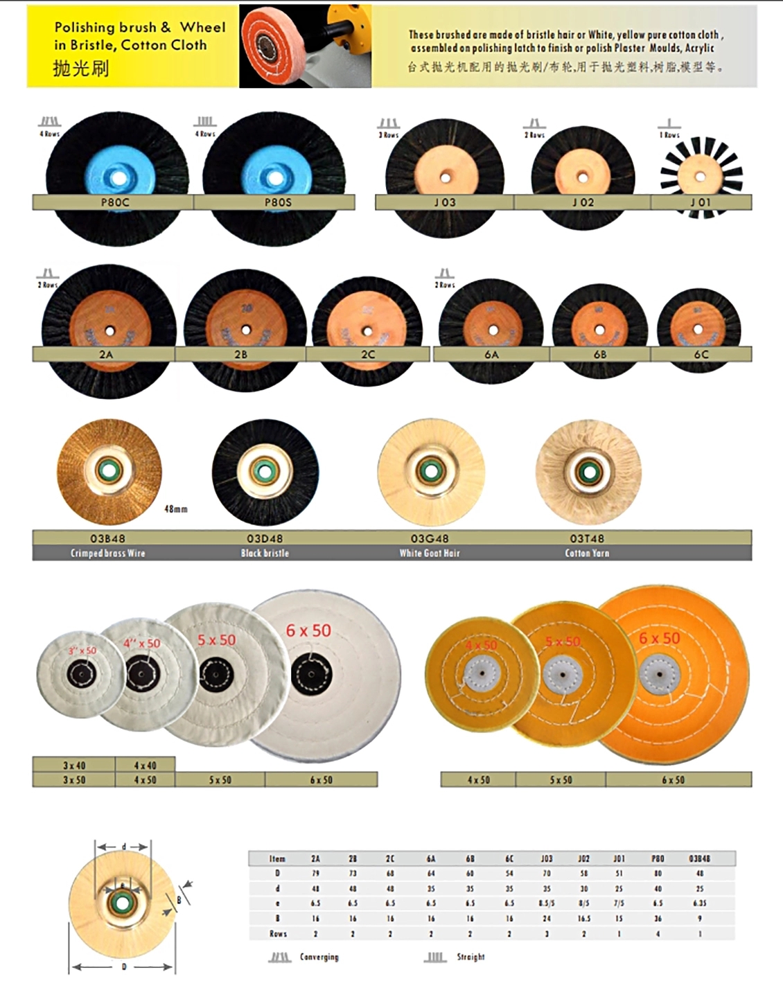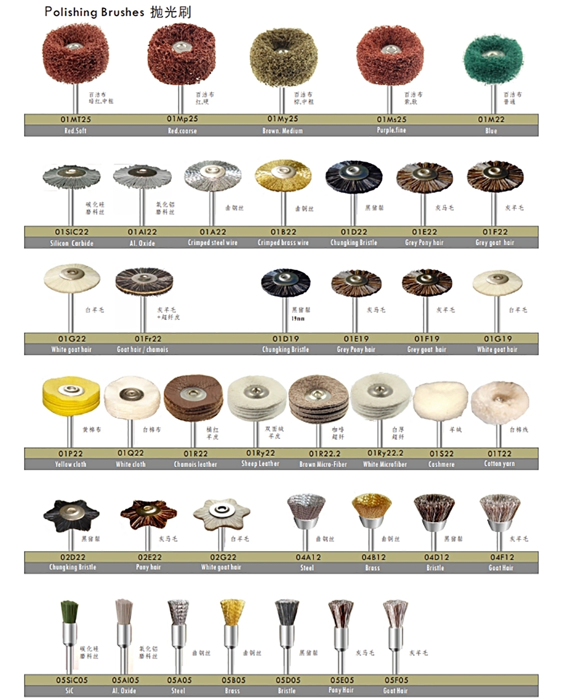 Dental Polishing Brush Apply on Ceramic, metal, jade, jewelry, etc . Made from a variety of material, these brushes is used for grinding, cleaning, polishing, smoothing and finishing ceramic, metal, jade, jewelry, etc. Stiff steel and brass rotary wire brushes mounted on HP-sized mandrels designed for tough cleaning tasks; Classic, high quality natural bristle brushes ideal for cleaning and polishing of denture acrylic, cleaning interproximal spaces after denture deflasking, and for general laboratory polishing applications; Durable cotton for application of smooth finishing and polishing materials; High quality fine white wool felt buffs designed for all types of polishing; Polyamide fiber with silicon carbide or aluminum oxide for pre-polishing metal; Non woven cloth brushes for remove scratches on acrylics or vaccum forming material, cleaning the oxidation layer of irregular and high demand surface of metal. high temperature resistant, can used with wate
