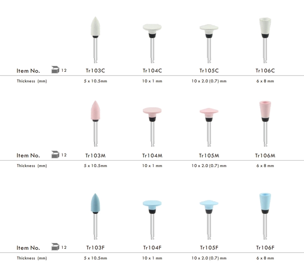 Dental Composite Resin Polishing Wheels and Diamond Impregnated System for Lab Tools Polishing disc kits are used for dental composite polishing. Recommended speed: 7,000-12,000 rpm/min. The polishing disc soft brush provides uniform results for heavy cleaning as well as pre-polishing and polishing. 4-color tooth polishing wheel, standard, Sr004M (blue); Fine, Sr004F (pink); Ultra-fine Sr304UF (gray); Extra-fine Sr304EF (yellow). It contains diamonds and high-quality resin to ensure the high quality of the polishing disc. It is especially suitable for the polishing of composite materials and resins, and can also be used for the polishing of ceramics and zirconia. Product Description Product Name: Dental rubber polishing machine/dental composite resin polishing wheel 4-stage polishing system: coarse/medium/fine/ultra-fine 1. Smoothing. 2. Pre-polishing. 3. High gloss polishing. Head: 11*2/14*2mm